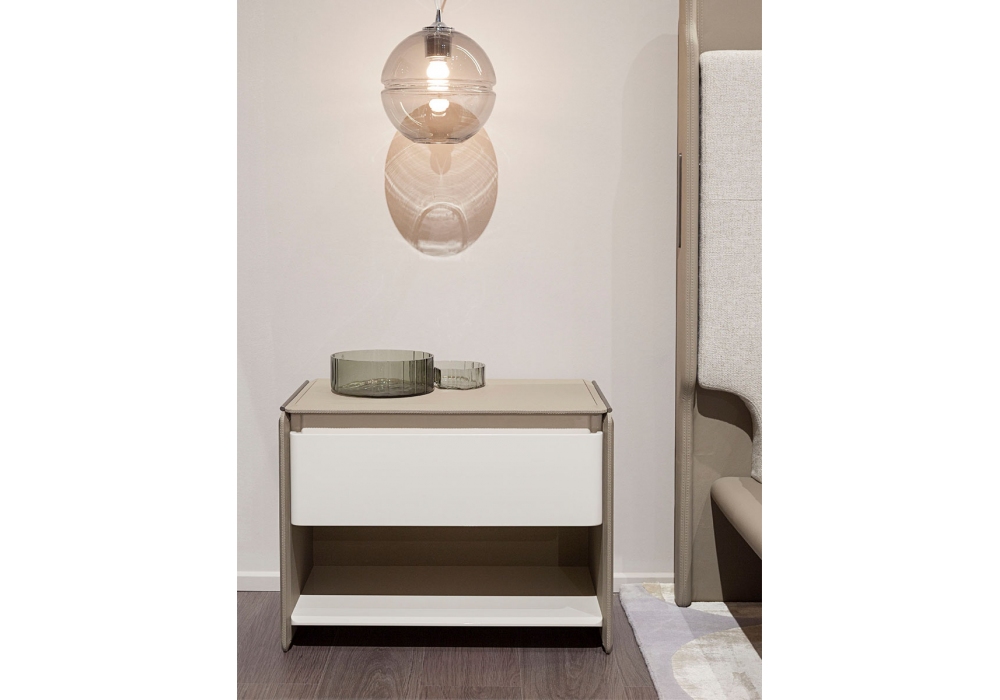 Zero diseñada por Andrea Bonini para Turri es una mesilla de noche con estructura en MDF y madera contrachapada con revestimiento en piel. Frentes de madera en acabado lacado brillo. Piezas metálicas en acabado mate.