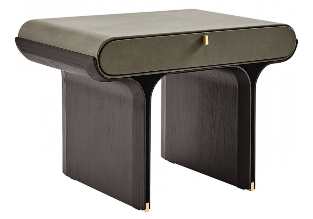Stami Night diseñada por Studiopepe para Gallotti&Radice es una mesilla de noche con cajón con curvas fresno teñido poro abierto negro base y detalles en latón brillante. Estructura de madera cubierta por cuero o ante según muestras.