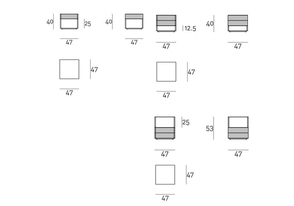 | Dimensiones | 47 x 47 x H 25 cm; 47 x 47 x H 12,5 cm; 47 x 47 x H 53 cm. |