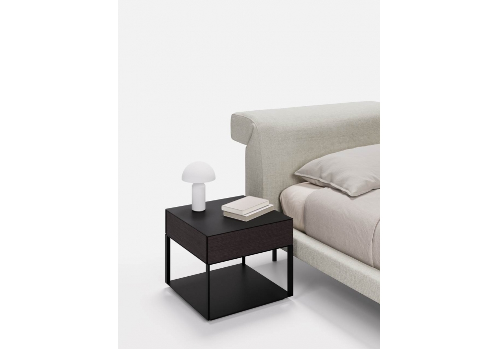 Halfsquare diseñada por Giacomo Moor para Living Divani es una mesita de noche cuadrangular con estructura portante en metal pintado en polvo y base de soporte en MDF negro. Los cajones son de MDF chapado en nogal Canaletto o gris rayado con laterales de metal negro carbón mate, mientras que el fondo y el fondo son de MDF lacado negro mate. Los pies de apoyo son regulables en PVC negro. Halfsquare está disponible en diferentes acabados y modelos.