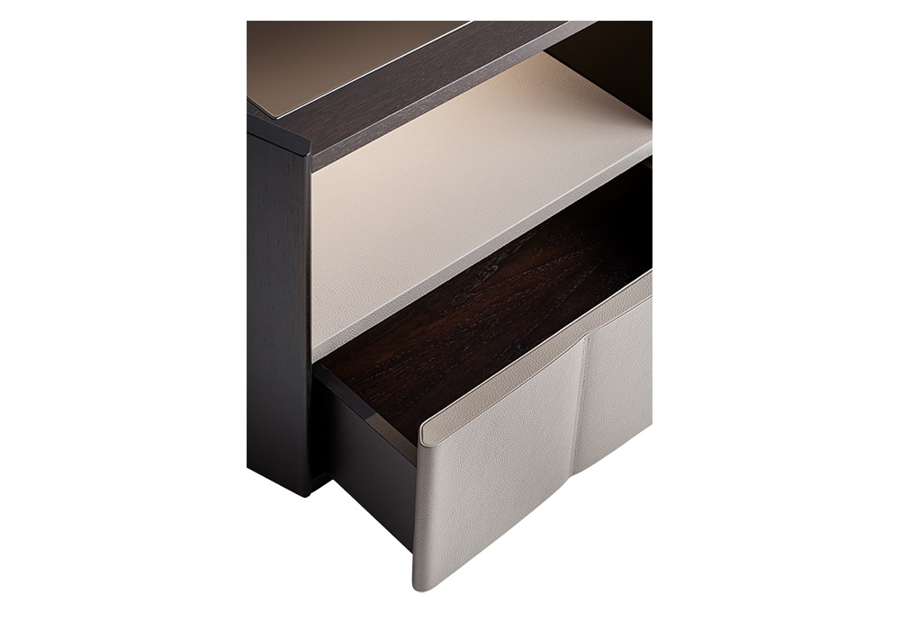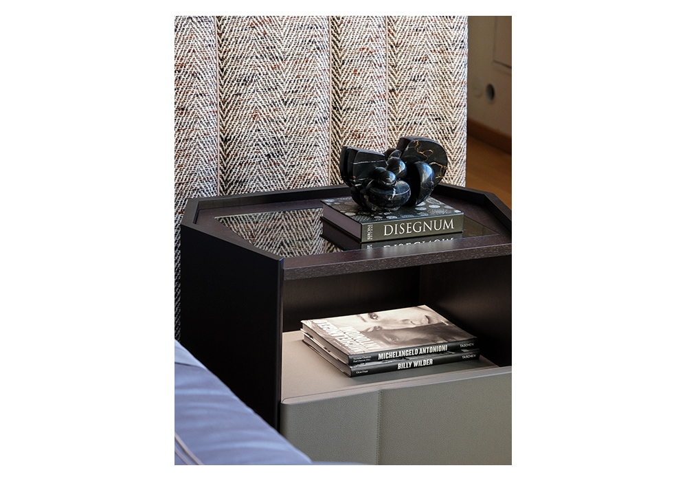 Delphi diseñada por Carlo Colombo para Giorgetti es una mesita de noche realizada en nogal canaletto, disponible en diferentes acabados y en la versión con LED y toma USB y USB-C o sin ella. Bajo pedido, los frentes pueden revestirse en piel en los colores disponibles.