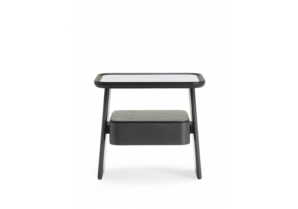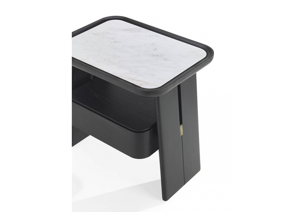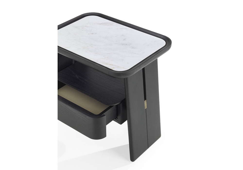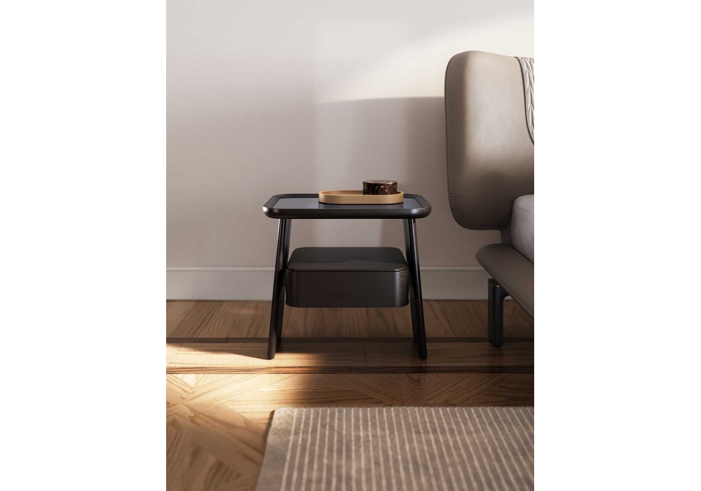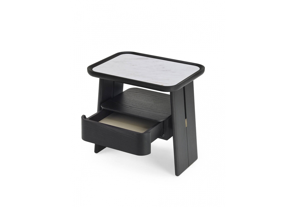Duo diseñada por Roberto Lazzeroni para Poltrona Frau & Ceccotti Collezioni es una mesita de noche de diseño con una línea esencial y elegante. La estructura y el marco de la balda son de madera maciza de fresno. La versión básica cuenta con dos montantes inclinados, unidos por un travesaño, que sostienen una superficie de apoyo. La mesita de noche DUO cuenta con tres módulos de pared: con cajón, balda o travesaño. La variante con cajón tallado en madera maciza con esquinas perfiladas incorpora un tirador integrado en el borde inferior del frontal para facilitar su apertura y cierre.