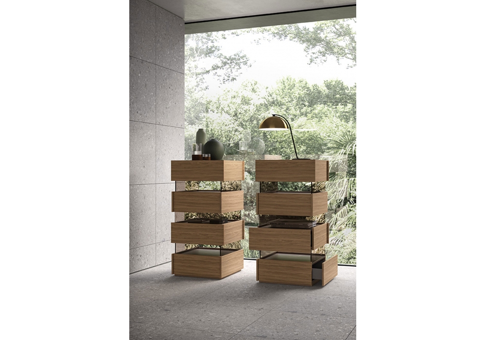 Cosmo diseñado por Kico es un sistema modular que permite apilar elementos de diferentes profundidades, alturas y anchuras. Una mesita de noche, una cómoda y una cómoda alta forman parte de un programa flexible y en constante evolución, ideal para personalizar tu dormitorio con estilo y funcionalidad.