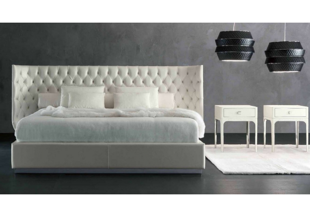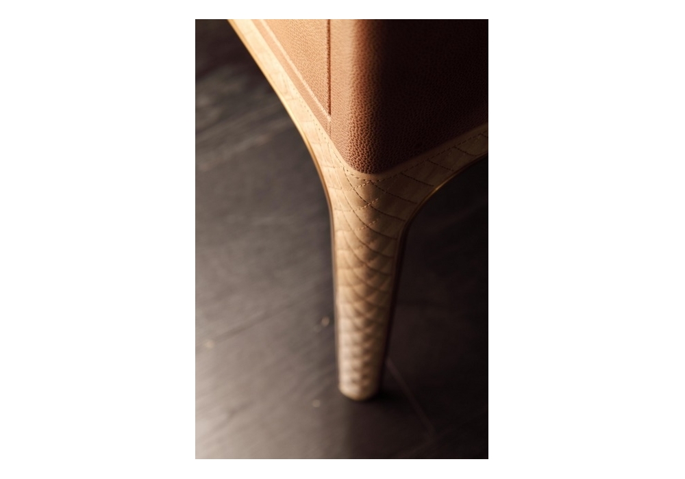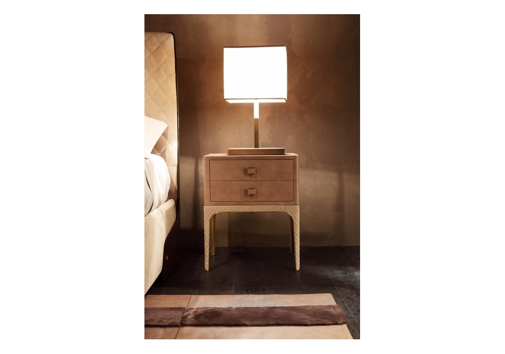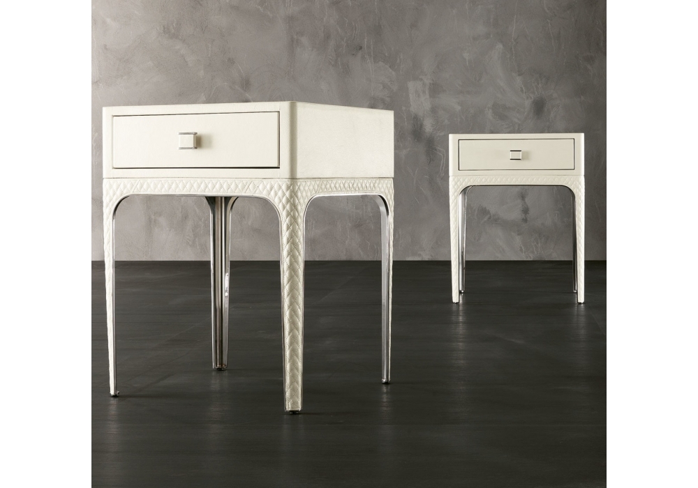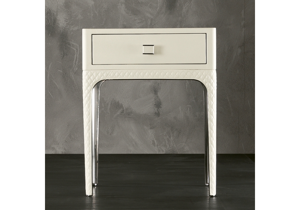 Charlie diseñada por Rugiano es una mesita de noche con revestimiento de piel. Detalles en acero o bronce. La mano de obra matelassé está hecha solo con pieles de gato suaves y lisas. CD. Disponible con uno o dos cajones.