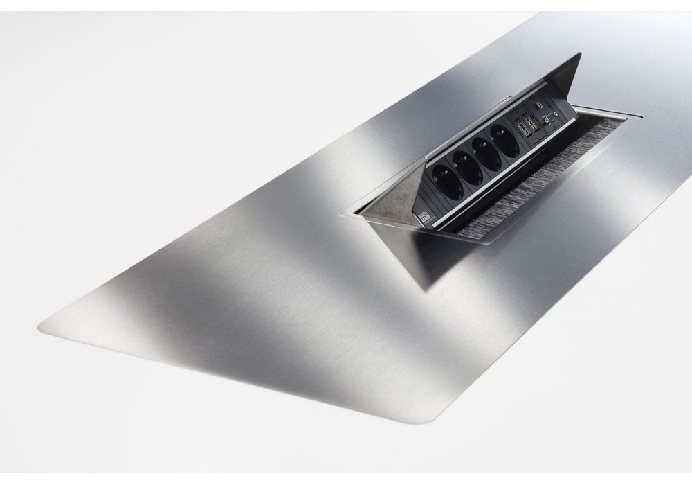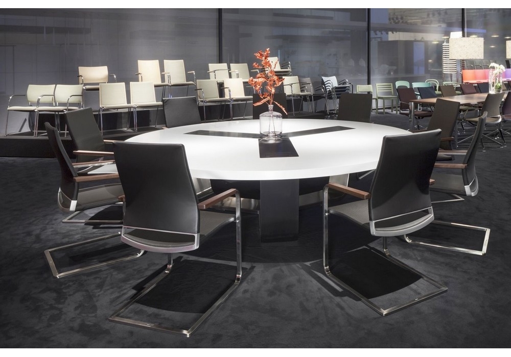 S 8100 diseñada por Hadi Teherani para Thonet es una mesa de conferencia redonda con estructura en acero inoxidable finamente pulido. Tablero de aglomerado con chapa de madera real o material compuesto mineral, blanco. Compartimento multifunción con tapa de acero inoxidable.