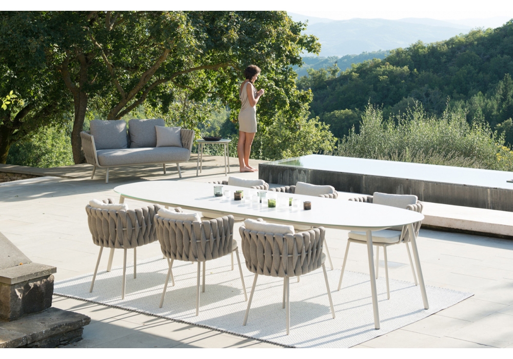 Tosca diseñada por Monica Armani para Tribù es una mesa con estructura en acero inoxidable con recubrimiento en polvo y tapa en cerámica, disponible en diferentes acabados y medidas.