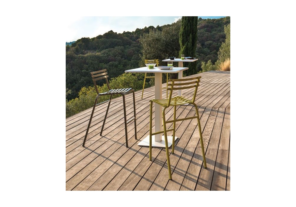 Flower producida y diseñada por Ethimo es una mesa fija de exterior con estructura de metal, pintada en diferentes acabados. Flowe está disponible en diferentes tamaños.