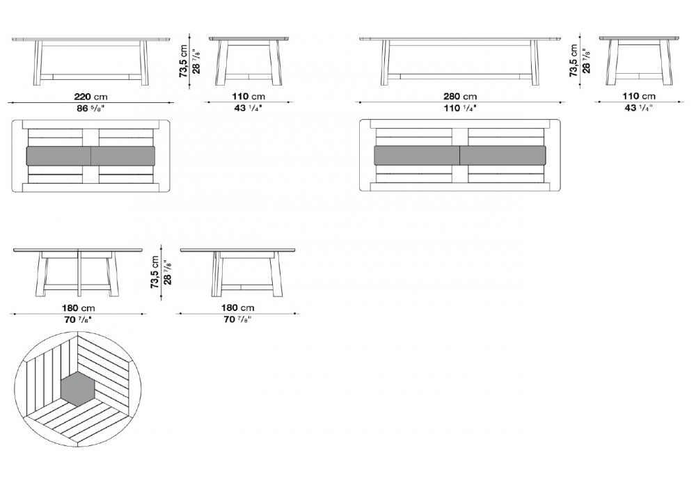 | Dimensiones | 220 x 110 x H 73.5 cm; 280 x 110 x H 73.5 cm; Ø 180 x H 73.5 cm. |