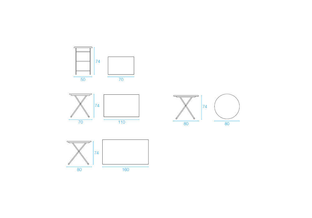 | Dimensiones | 70 x 50 x H 74 cm; 110 x 70 x H 74 cm; Ø 80 x H 74 cm |