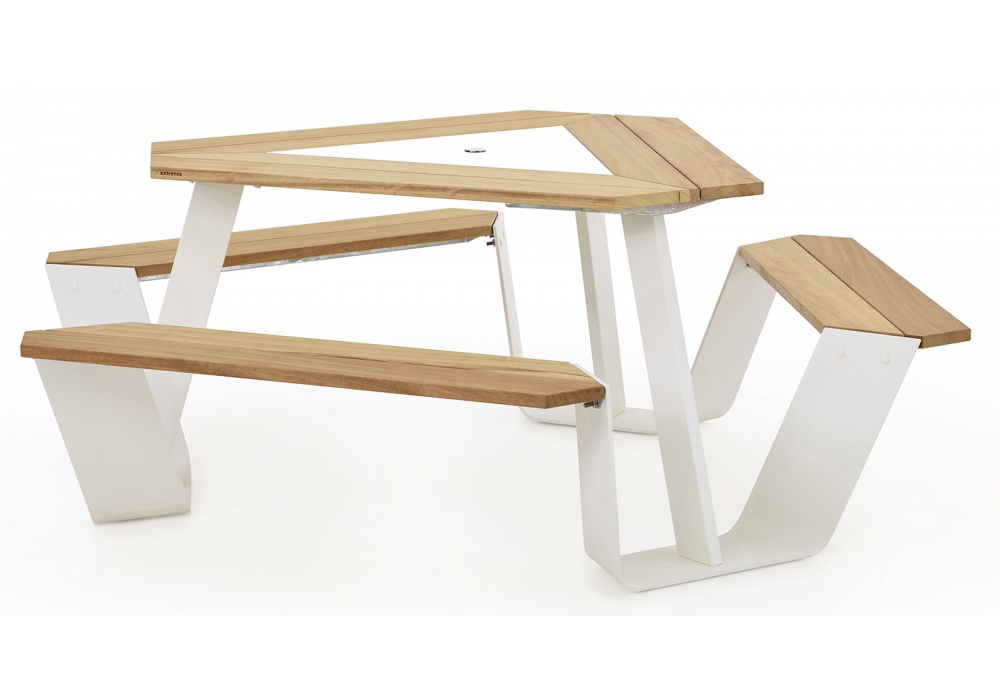 Anker diseñada por Dirk Wynants para Extremis es una mesa para picnic con estructura de acero y tablero de madera. En combinación con el quitasol Inumbrina es una instalación llamativa impresionante. Sea creativo con los diferentes colores de madera y acero para hacer su combinación favorita que se adapte a su estilo de vida.