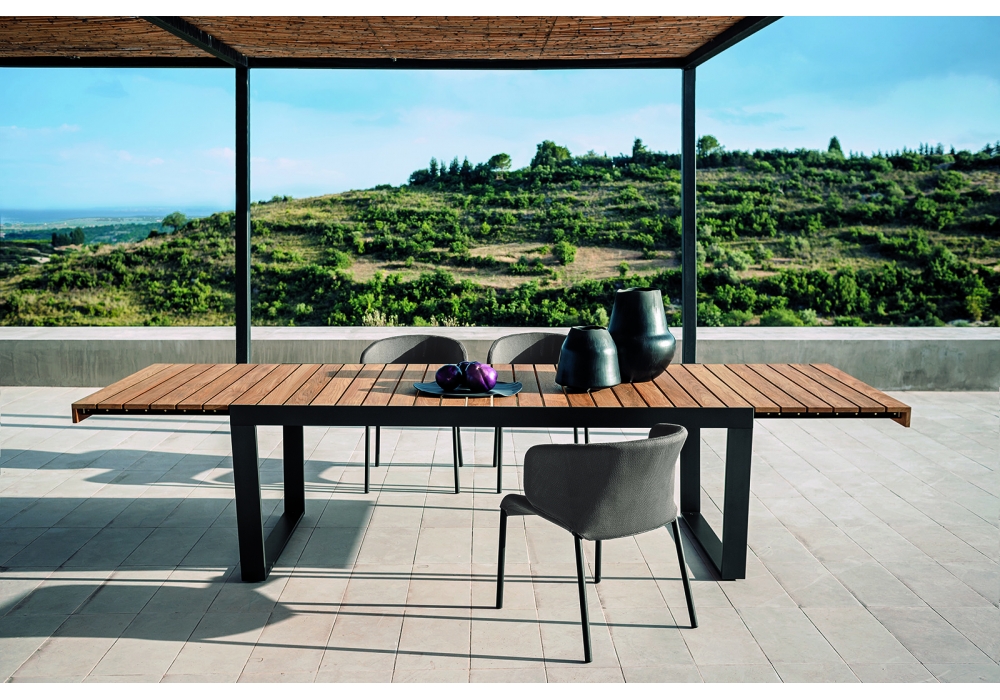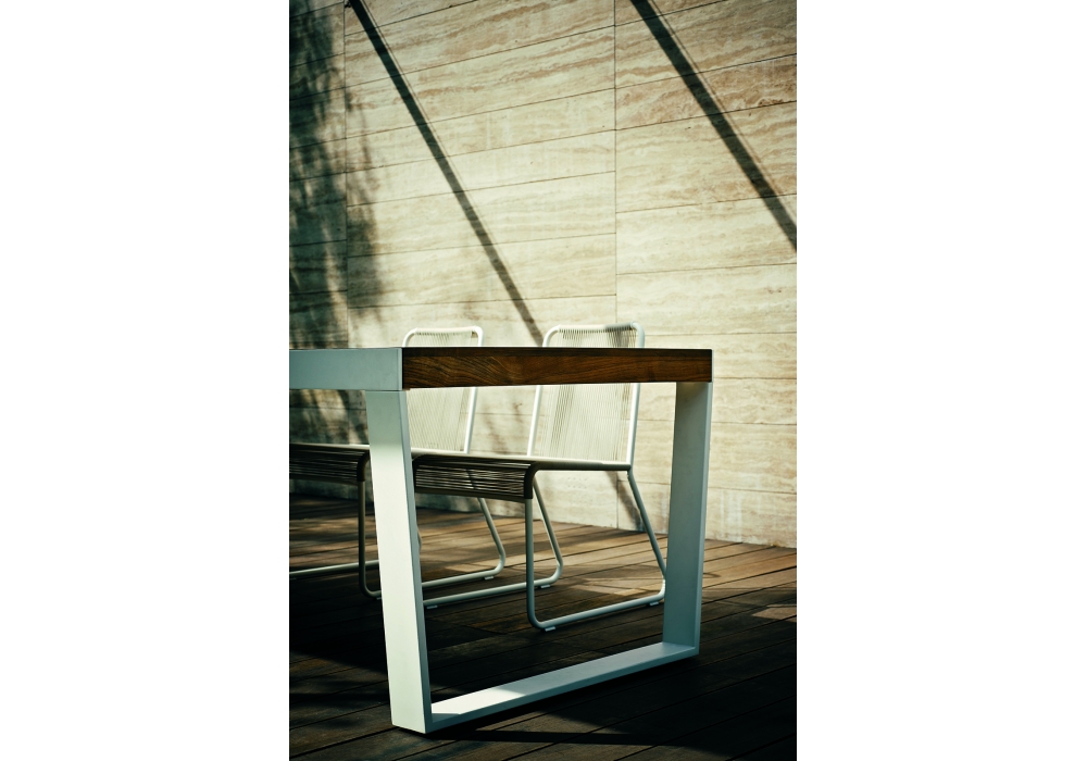 Spinnaker 034 diseñada por Gordon Guillaumier para Roda es una mesa extensible para uso exterior con estructura de acero inoxidable barnizada en polvo y tablero en teca. La mesa Spinnaker es capaz de alojar hasta doce personas cómodamente y extrae su poder expresivo desde un diseño severo y extremadamente moderno, que simultáneamente destaca la solidez del material y la ligereza de la parte superior. Estructura disponible en dos acabados.