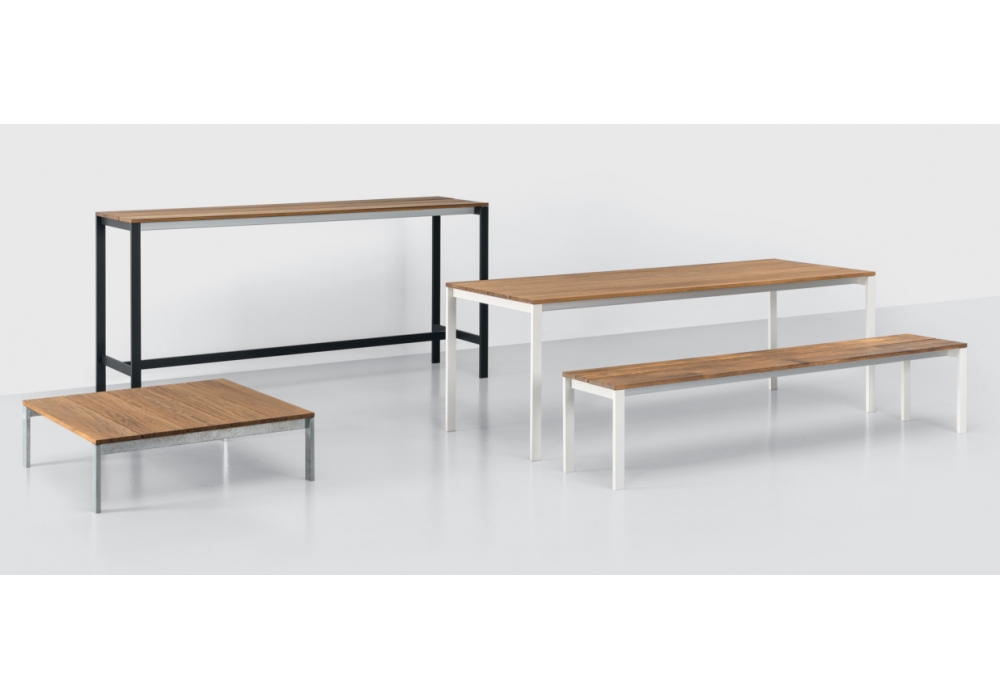 Be-Easy Slatted diseñada por Bluezone para Kristalia es una mesa de bar para exterior con patas de acero y tablero de listones de aluminio o teca. Disponible en diferentes acabados y dimensiones.