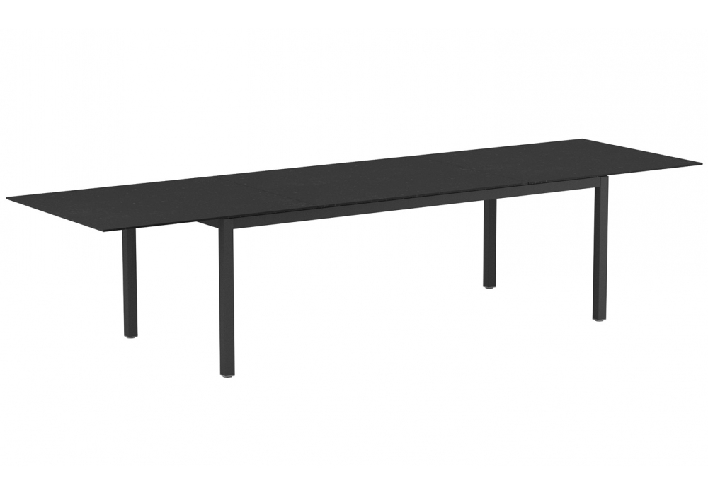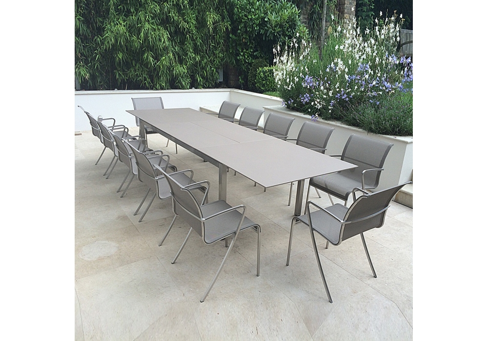 Taboela diseñada por Kris Van Puyvelde para Royal Botania es una mesa extensible con estructura en acero inoxidable y tapa en cerámica o teca. Disponible en diferentes acabados.