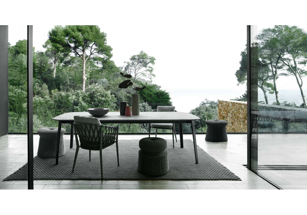 Ginepro diseñada por Antonio Citterio para B&B Italia Outdoor es una mesa en aluminio antracita pintada y piedra serpentina. Disponible en diferentes medidas.