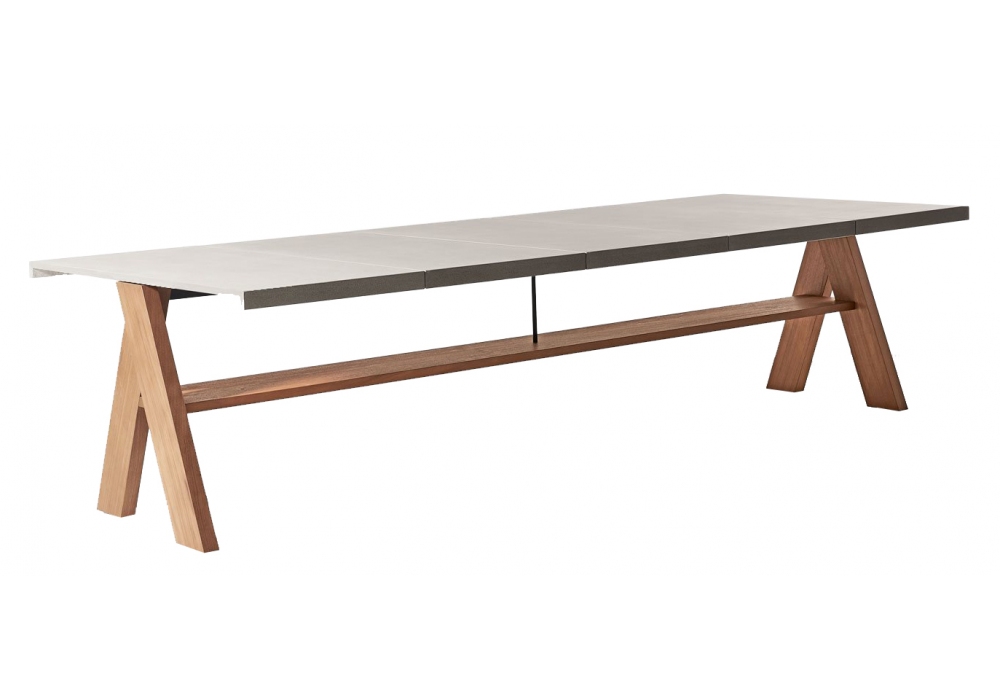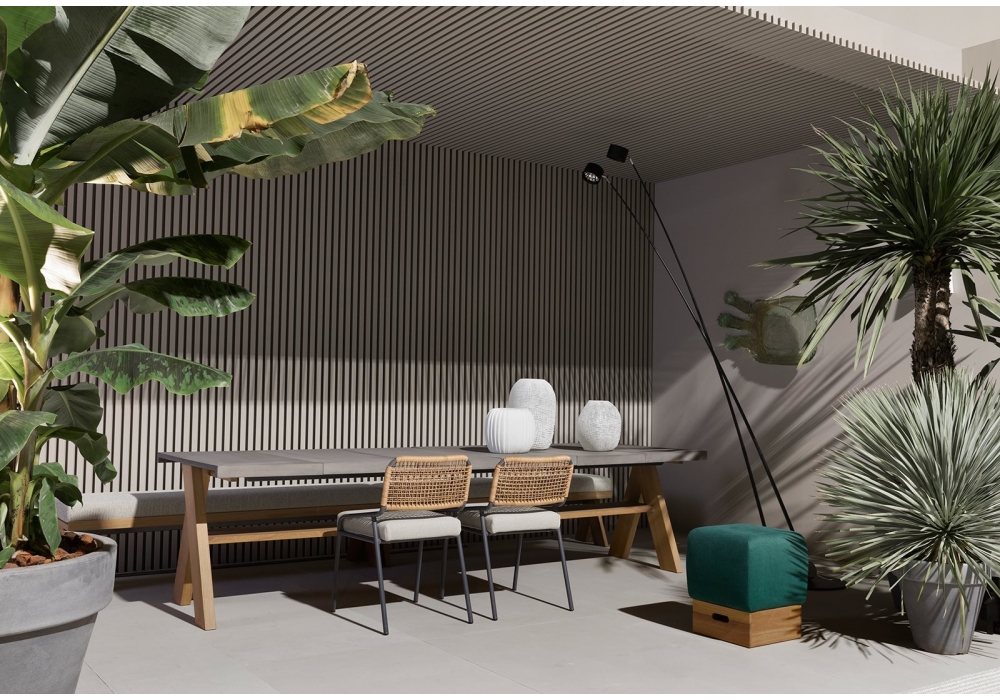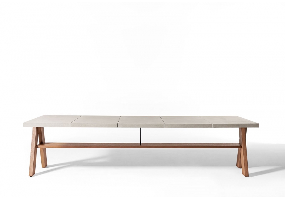 Joi Open Air diseñada por Andrea Parisio para Meridiani es una mesa de comedor al aire libre con patas en iroko sólido, estante en álamo multicapa iroko y parte superior en UHPC reforzado con fibra en acabado gris claro con tratamiento protector.