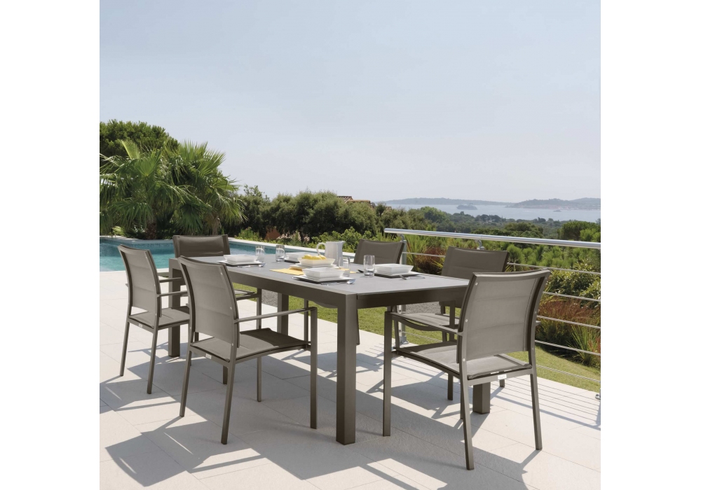 Touch diseñada para Talenti es una mesa con estructura de aluminio y tapa de cristal del mismo color que la estructura. Disponible en diferentes acabados y tamaños.