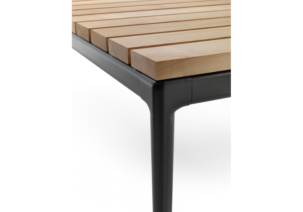 Pico Outdoor diseñado por Design Center para Flexform es una mesa disponible en varios tamaños. La parte superior puede ser de piedra o madera y la base de aluminio está disponible en varios acabados.