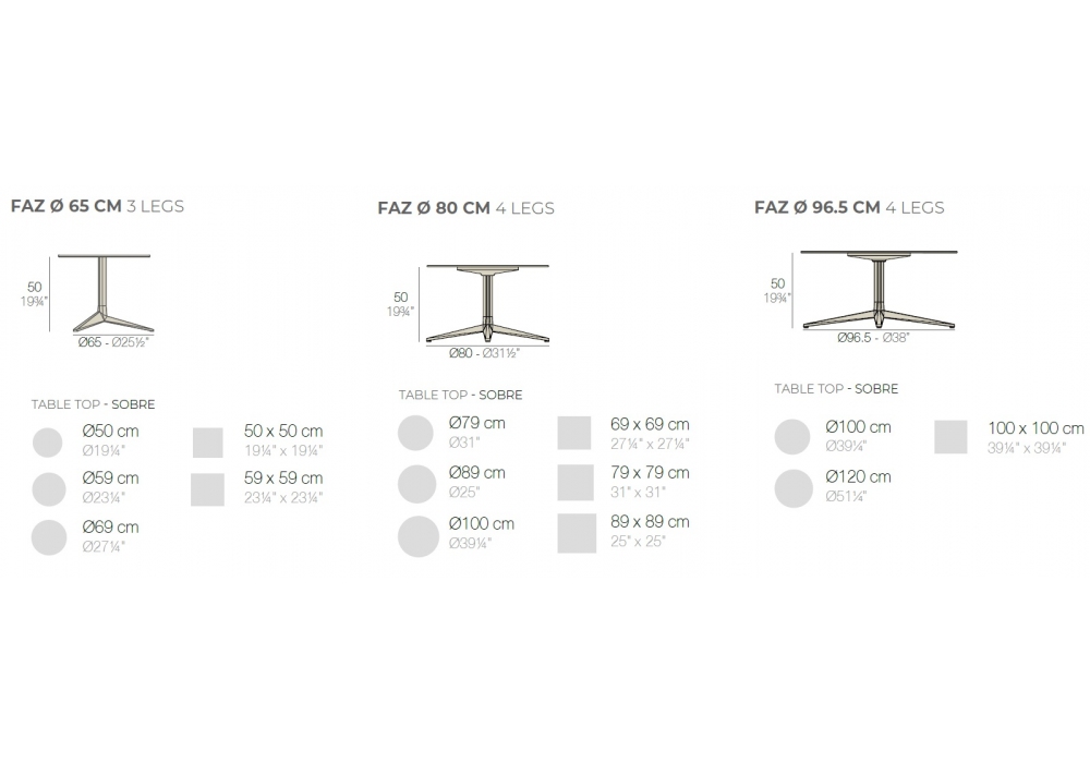 | Base | Ø 65 x H 50 cm; Ø 80 x H 50 cm; Ø 96.5 x H 50 cm. |