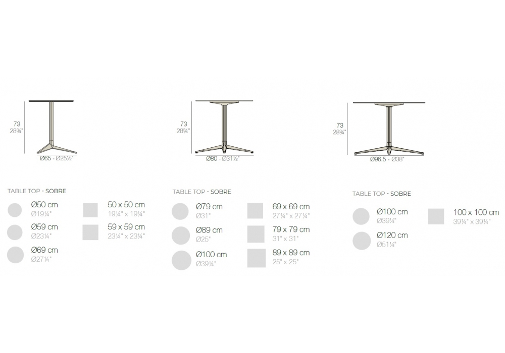 | Base | Ø 65 x H 73 cm; Ø 80 x H 73 cm; Ø 96.5 x H 73 cm. |