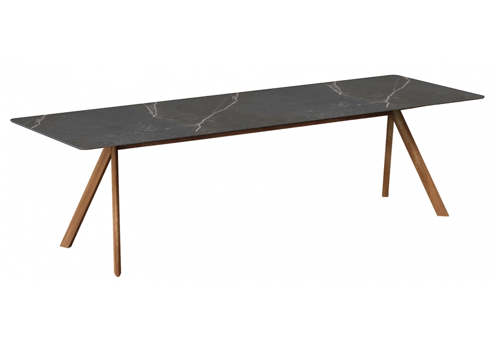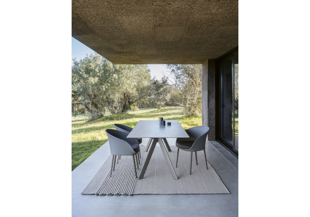 Atrivm Outdoor diseñada por Manel Molina para Expormim es una mesa de comedor rectangular con estructura y patas de perfil de aluminio de alta resistencia, acabado con polvo de poliéster o madera de sapeli certificada FSC® C164846. Tablero disponible en HPL o Dekton.