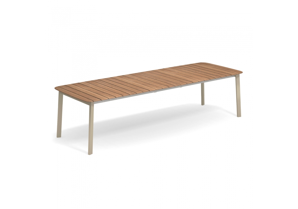 Shine diseñada por Arik Levy para Emu es una mesa realizada con estructura de aluminio pintado y tablero de teca.