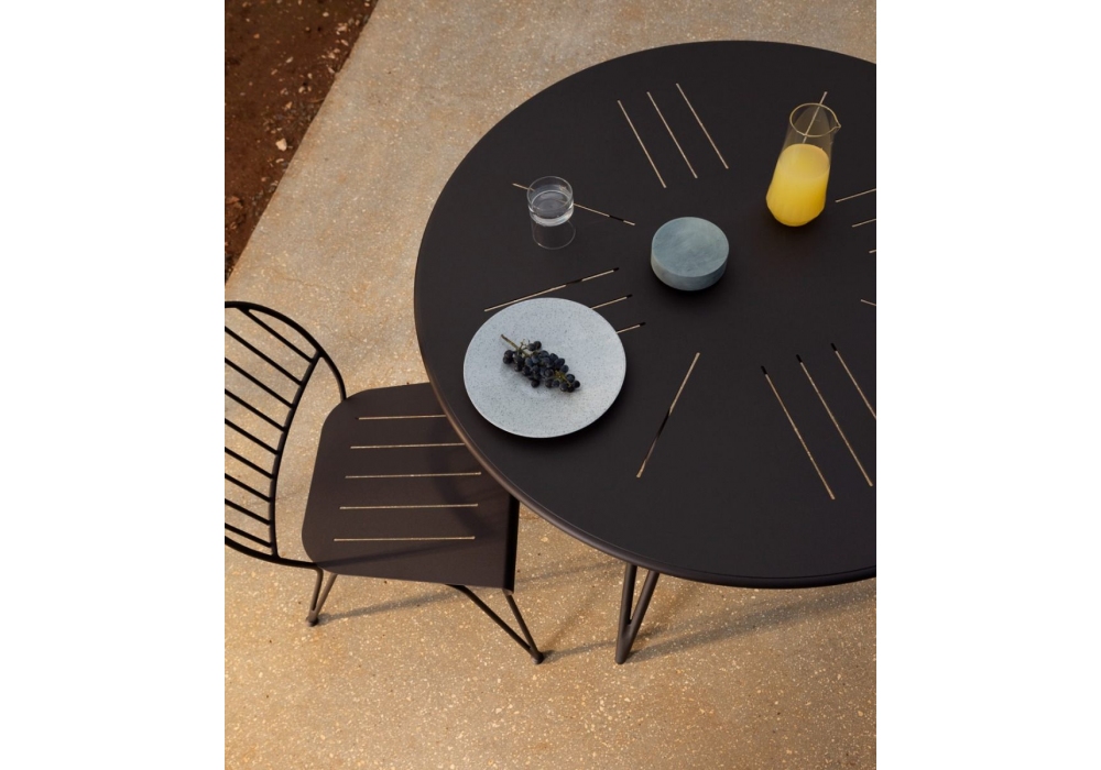 Ariete diseñada por Adam D. Tihany para Unopiù es una mesa de exterior circular. La estructura en hierro forjado trabajado a mano y pintado con polvos de bronce.