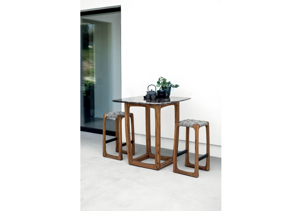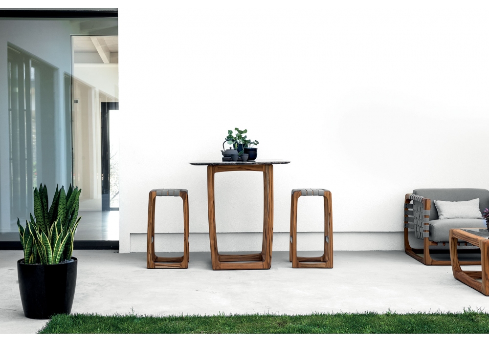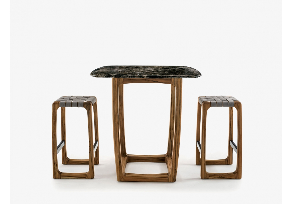 Bungalow Marble Outdoor diseñada por Jamie Durie para Riva 1920 es una mesa de bar compuesta por una estructura de madera maciza de teca completamente torneada, ensamblada y alisada a mano, con una base cuadrada combinada con una tapa de mármol con lados redondeados y salientes.