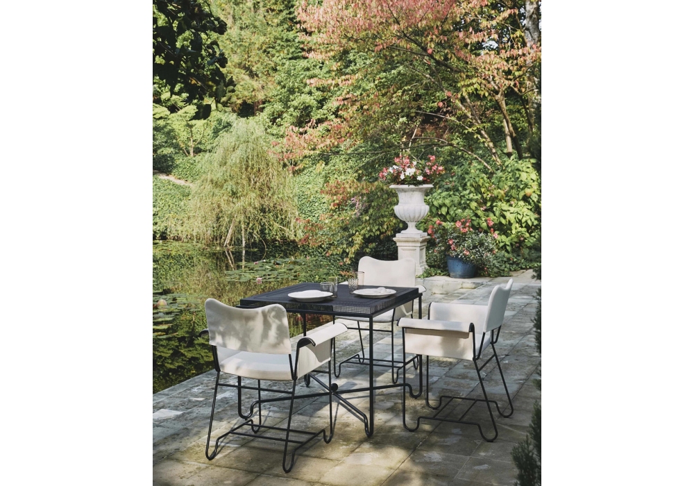 Tropique diseñada por Mathieu Matégot para Gubi es una mesa de exterior con estructura en acero inoxidable.