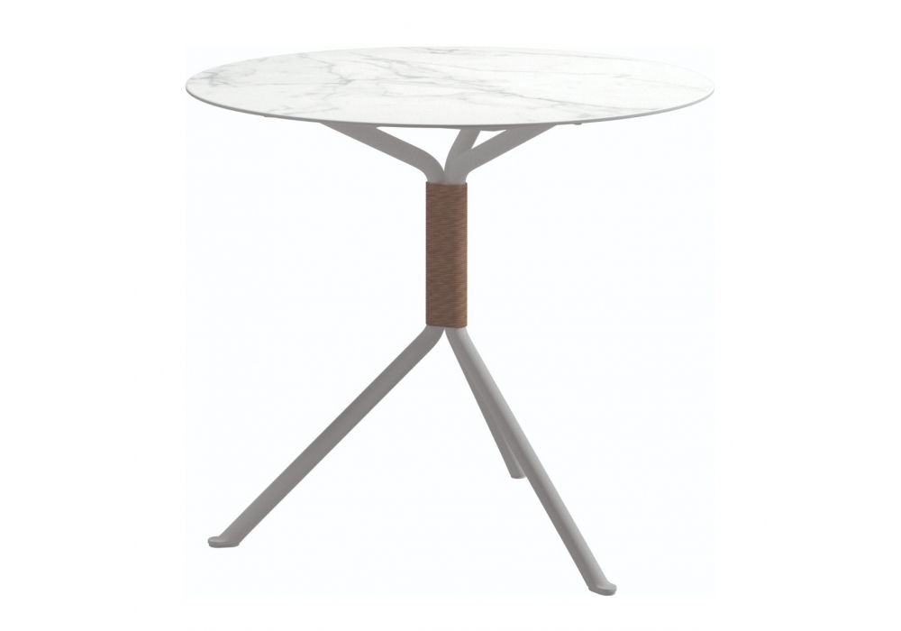 Fresco diseñada por Matteo Thun para Gloster es una mesa para exteriores compuesta por una estructura de aluminio con recubrimiento de polvo y mimbre tejido y tablero de cerámica de una pieza con borde de aluminio con recubrimiento de polvo.