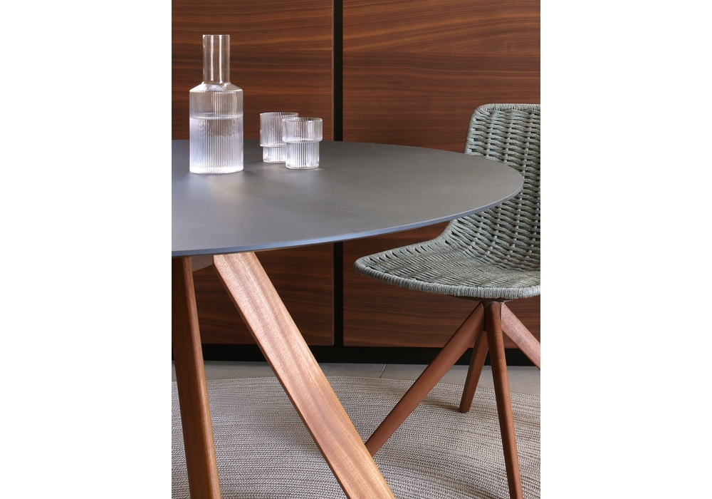 Atrivm Outdoor diseñada por Manel Molina para Expormim es una mesa redonda con estructura y patas de perfil de aluminio de alta resistencia, acabado con polvo de poliéster o madera de sapeli certificada. Disponible en dos tamaños.