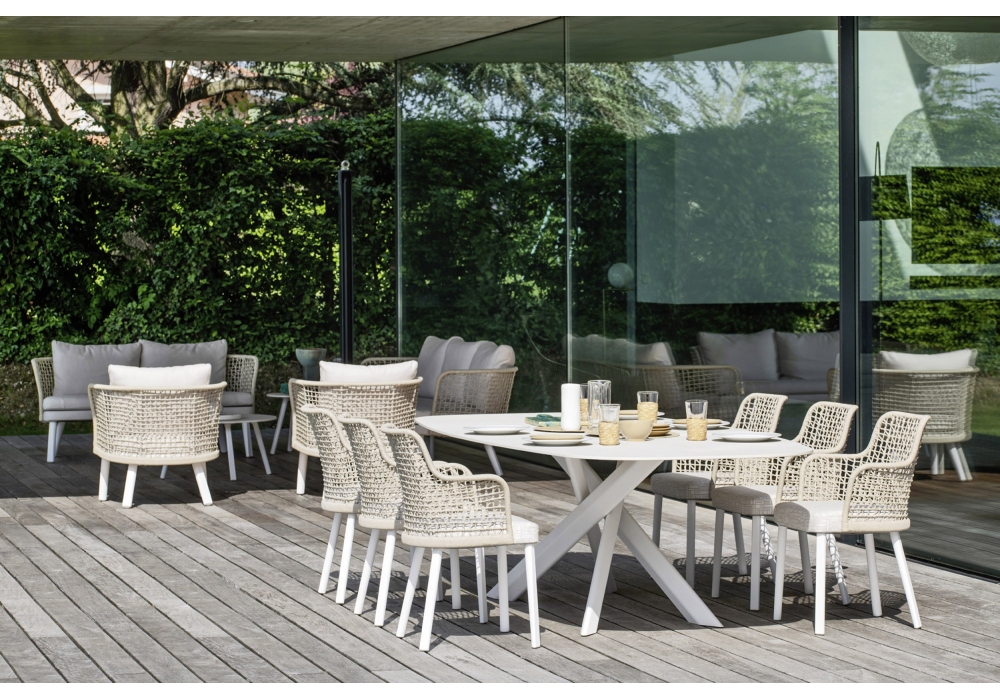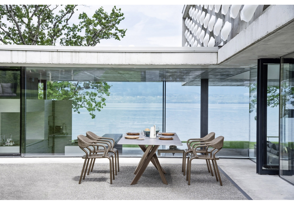 System Star diseñada por Daniele Lo Scalzo Moscheri para Varaschin es una mesa con estructura de aluminio pintado en polvo y tableros cuadrados, redondos, rectangulares y elípticos en HPL o cerámica. Disponible en diferentes acabados y en varios tamaños.