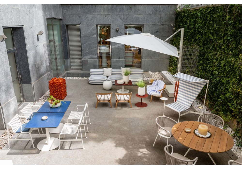 Branch Table Lido diseñada por Jakob Wagner para Cappellini es una mesa para exteriores realizada con tablero de listones de iroko macizo crudo y base compuesta por elementos modulares conectados entre sí, realizados en aluminio fundido a presión, con recubrimiento de polvo gofrado.