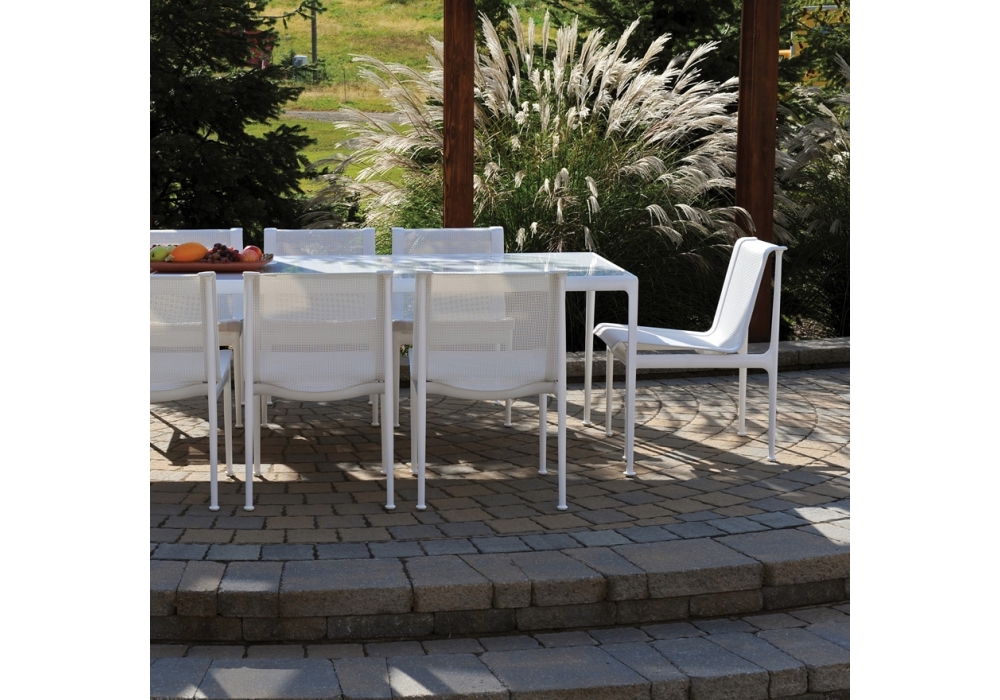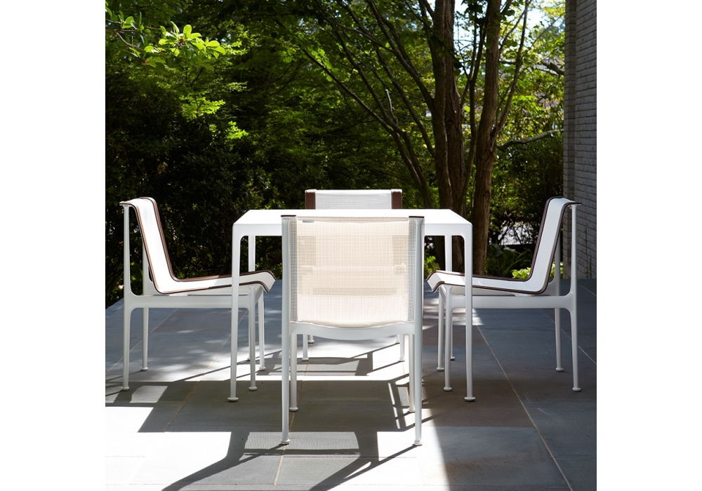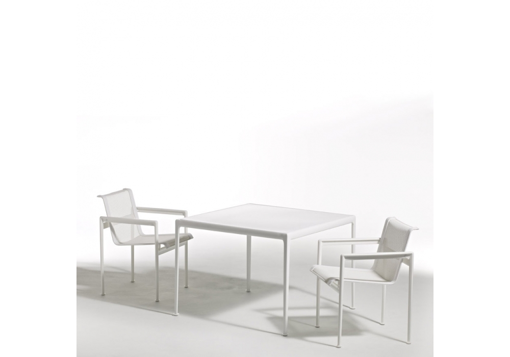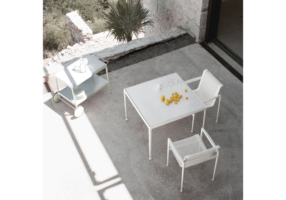 1966 Firmada por Richard Shultz para Knoll, es una mesa con base de aluminio extruido y fundido a presión con pintura de poliéster resistente a la intemperie. Tablero de acero porcelánico en bronce oscuro o blanco. Disponible en varios tamaños.