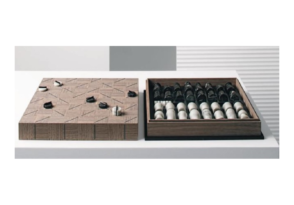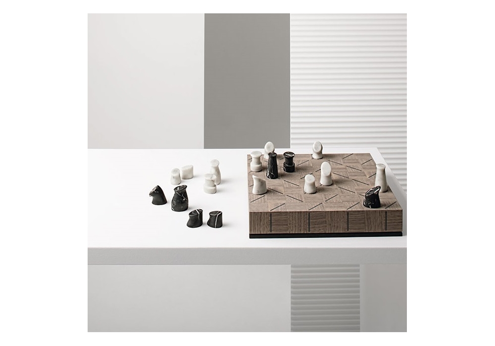 Check-Mate diseñado para Dominic Siguang Ma para Giorgetti es un tablero de ajedrez realizado en nogal canaletto con acabado gris (2W). Las piezas del juego, por formas asimétricas, en mármol calacatta oro y mármol negro, son contenidas en el interior tapizado en piel.