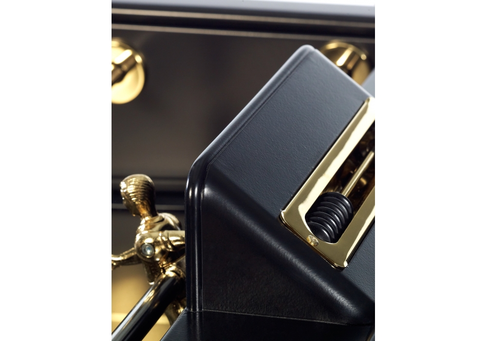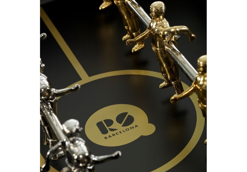 RS#3 Wood Gold diseñada por Rafael Rodríguez para RS Barcelona es una futbol de mesa con patas y manijas en madera de iroko. Detalles chapados en oro 24k.