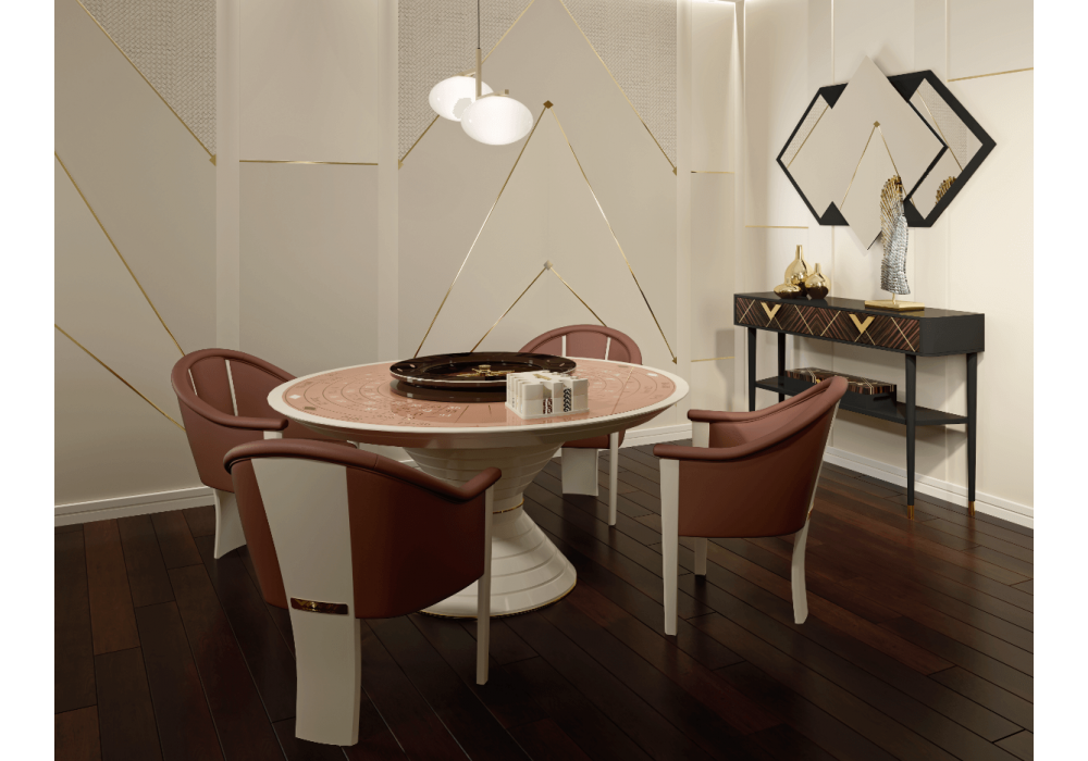 Round Table 160 diseñada por Vismara Design es una mesa de ruleta redonda multifuncional realizada en vidrio templado serigrafiado con dos mesas de ruleta. Ruleta central revestida con funda extraíble, elemento lazy susan en vidrio y madera, borde de mesa lacado soft touch y base lacada con perfiles de acero.