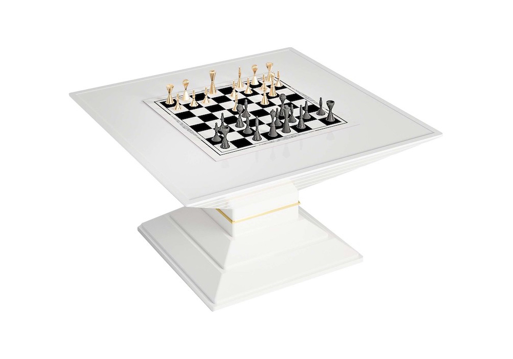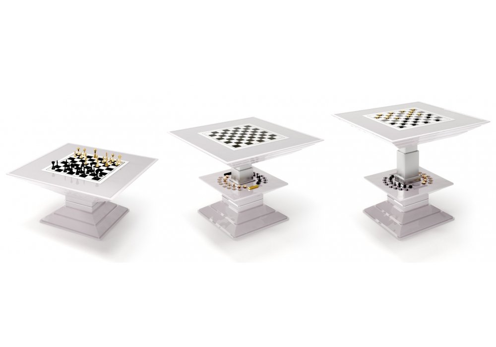 Squared Game diseñada por Vismara es una mesa de ajedrez equipada con un mecanismo de elevación alimentado por una batería recargable. Tapa de cristal templado con incrustaciones de tablero de ajedrez en madera de ébano, arce y nácar. Piezas de ajedrez y damas incluidas, fabricadas en aluminio, ajedrez y damas en color champagne y negro. Completo con copa de backgammon de madera con 5 dados. Compartimentos para guardar el playset, estructura lacada con detalle de acero.
