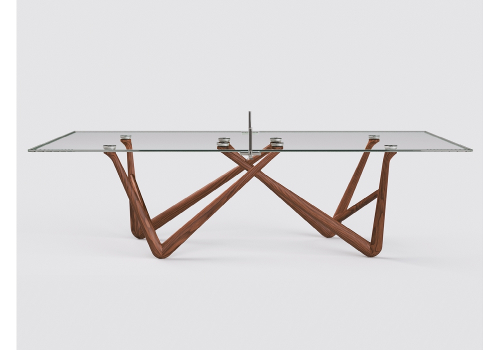 Effetto 71, diseñada por Adriano Design Engineered by Teckell® R&D Department, es una mesa de ping pong fabricada con tapa de cristal y estructura de nogal americano macizo.