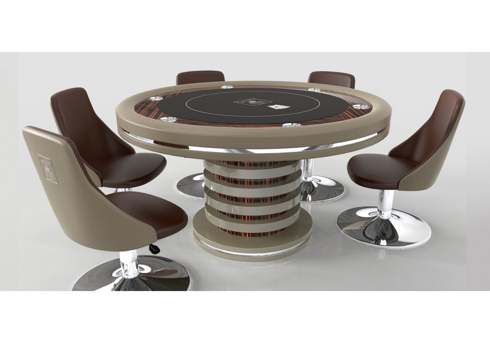 Grecale diseñada por Cavicchi es una mesa de póquer, la superficie de juego circular, completamente revestida en el borde, se apoya en la refinada base de la torre donde se alternan discos especiales acabados en maderas preciosas y lacas. Diferentes acabados disponibles bajo pedido.