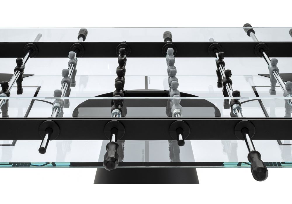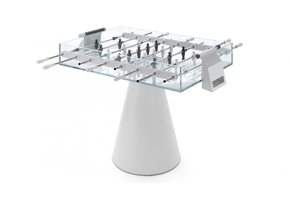 Ghost diseñado por Basaglia + Rota Nodari para Fas Pendenza es un futbolín cuadrangular con un campo de juego de cristal transparente. El mueble está fabricado íntegramente en cristal transparente. La base es de forma cónica en metal pintado en color resistente a los arañazos y con pies regulables. Ghost está disponible en diferentes acabados y versiones de eje, se suministra con 5 bolas de juego blancas.