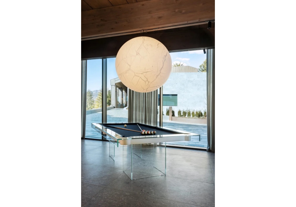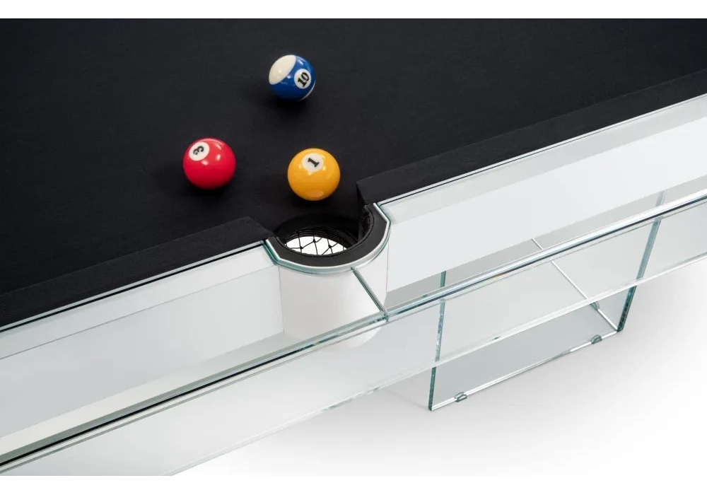 Shadow diseñada por Basaglia + Rota Nodari para Fas Pendenza es una carambola de forma cuadrangular con campo de juego realizado en madera lacada en blanco, una pieza única de tablero de juego de pizarra. La estructura perimetral y las patas son íntegramente de cristal transparente. Shadow viene con 4 nervaduras; juego de bolas numeradas Ø 57; caja de yeso; triángulo para bolas; cepillar.