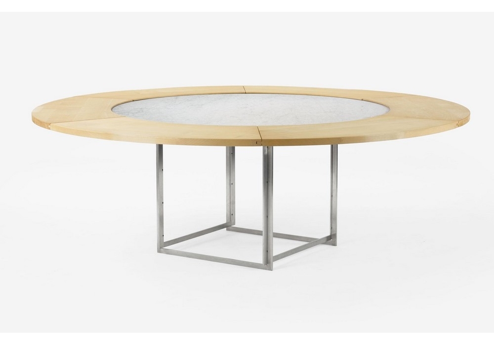 PK54 + PK54A diseñada por Poul Kjærholm para Fritz Hansen es una mesa realizada con tablero en mármol o granito y base en acero inoxidable cepillado satinado. Anillo de expansión, 6 secciones, en arce macizo sin tratar. Disponible en diferentes acabados.