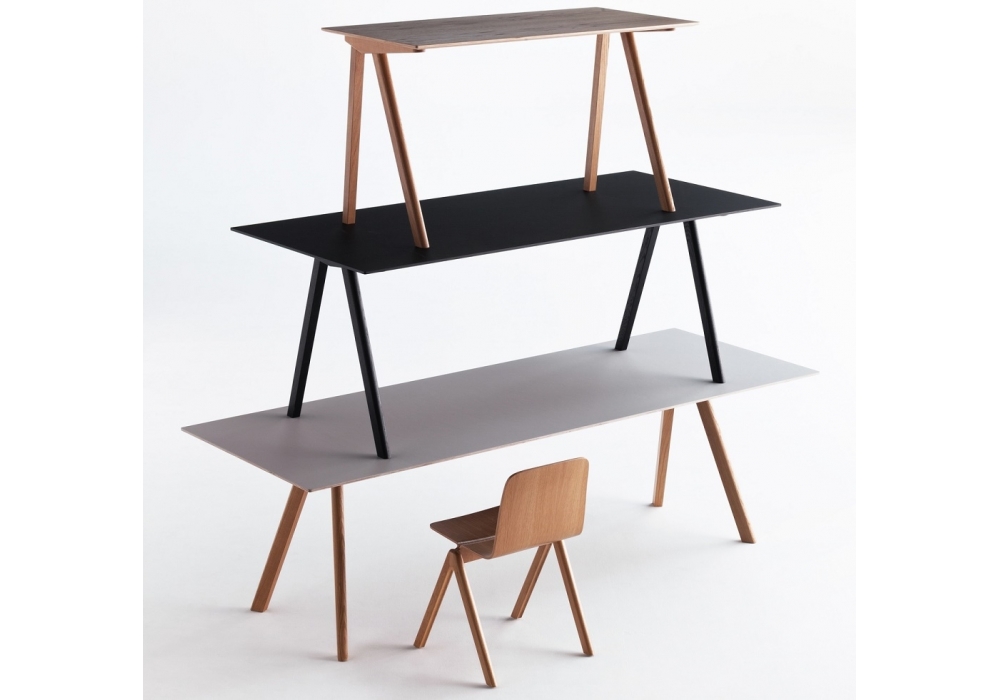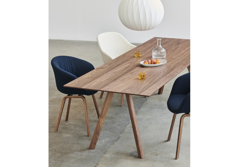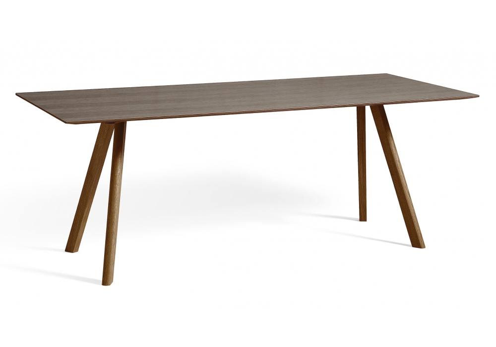 Copenhague CPH 30 diseñada por Ronan y Erwan Bouroullec para Hay es una mesa con tablero de madera contrachapada con laminado, linóleo o chapado en diferentes acabados. El borde del tablero está biselado y hace juego con el acabado de la base. Patas inclinadas de madera provistas de tornillos invisibles integrados. Pies ajustables extensibles para nivelar la mesa en superficies irregulares. Disponible en diferentes medidas y acabados.
