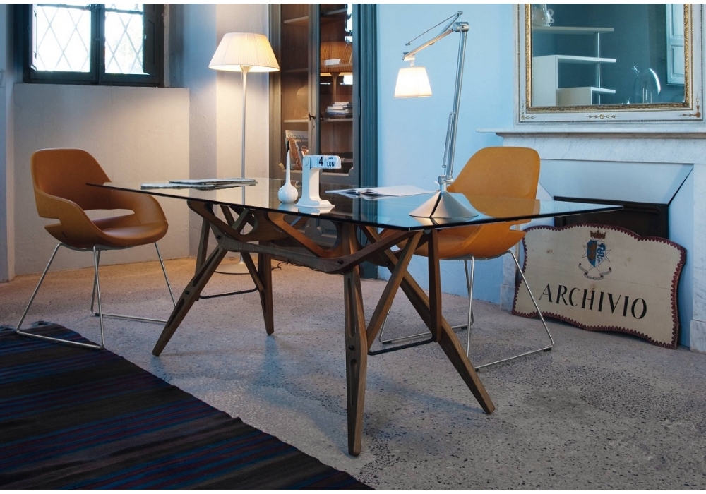2320 Reale diseñada por Carlo Mollino para Zanotta es una mesa con superficie de cristal transparente con o sin cantos biselados o en mármol Emperador, con barniz protector antimanchas. Estructura en roble natural, nogal Canaletto o teñido de negro. Disponible en diferentes dimensiones.