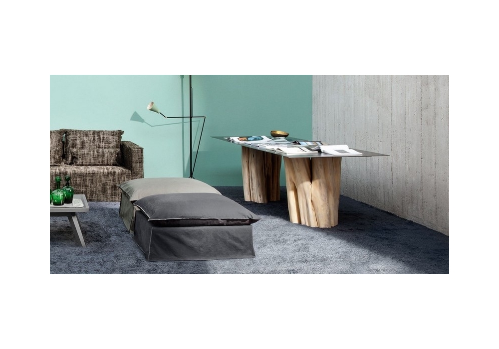 Brick diseñada por Paola Navone para Gervasoni es una mesa rectangular con base realizada con secciones de tronco de carpe natural descortezado, tapa rectangular en chapa de hierro encerado.