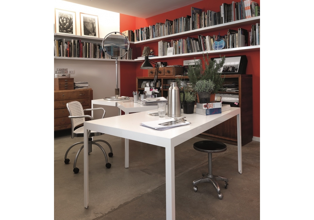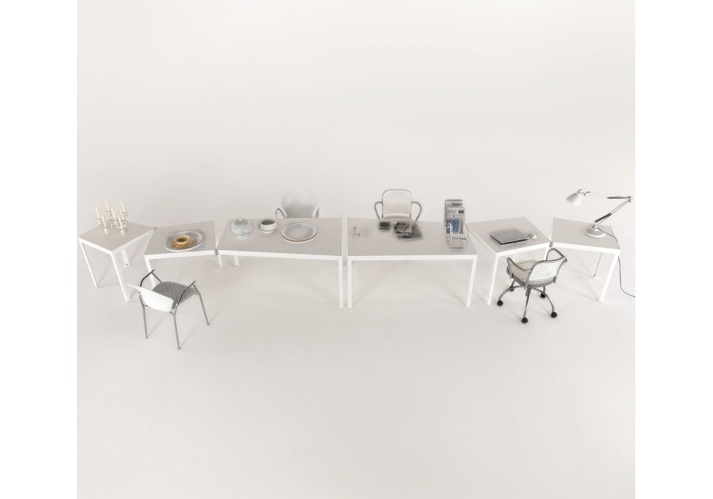 Campo D'Oro diseñada por P. Pallucco y M. Rivier para da DePadova es una mesa con base de acero pintado en polvo blanco con bisagras de acero inoxidable. Está compuesta por tres elementos trapezoidales que crean la tapa y permiten obtener una mesa de diferentes formas. Cerrado es cuadrado; al girar los elementos, la mesa se abre tomando diferentes configuraciones. Pies regulables en acero inoxidable.
