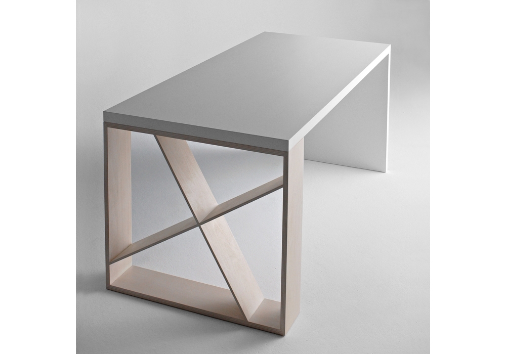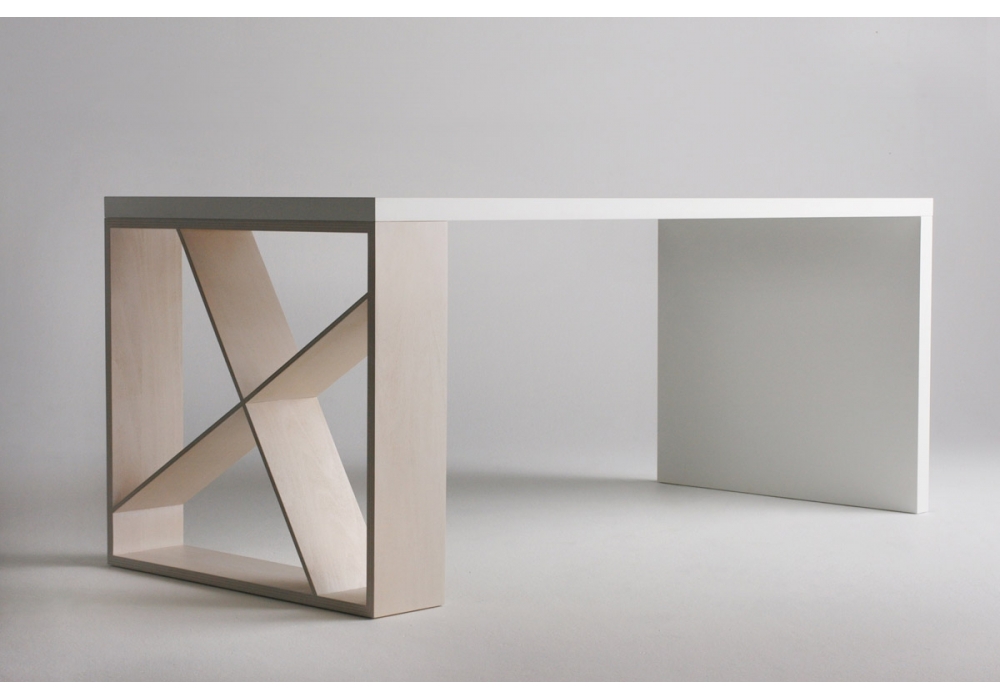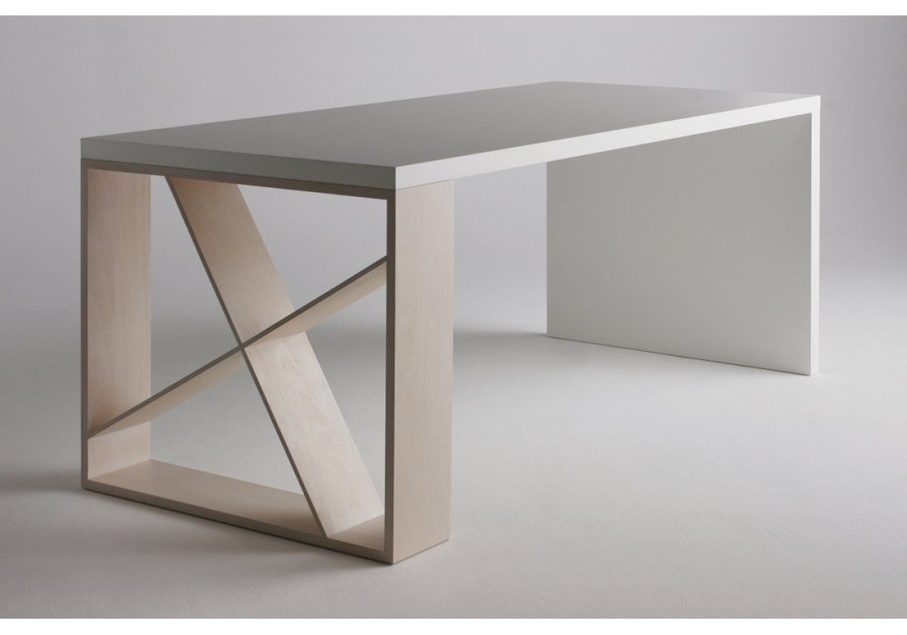 J-Table diseñada por Jean Francois Gomrée para Casamania & Horm es una mesa realizada con tapa de nido de abeja, chapada en laminado blanco. Una pata en MDF chapada en laminado blanco y una pata en contrachapado de haya chapada en nogal o roble. Disponible en diferentes dimensiones.