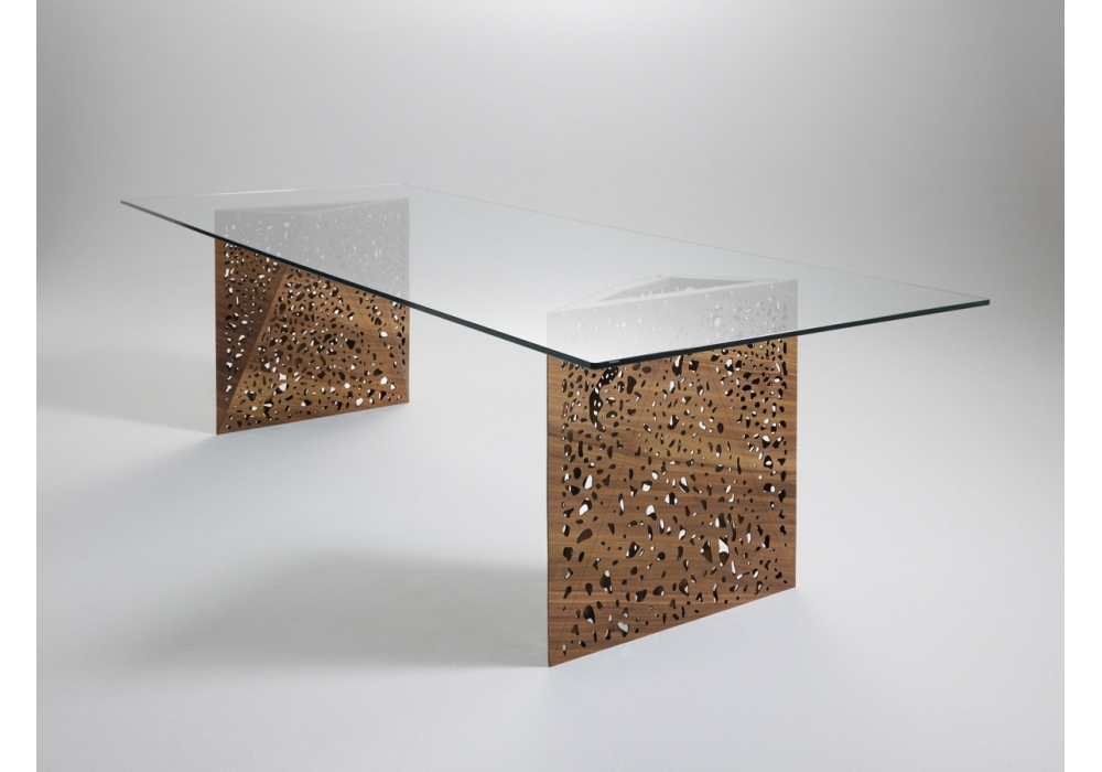 Riddled diseñada por Steven Holl para Casamania & Horm es una mesa realizada con tapa de vidrio templado. Patas de madera de origami en nogal Canaletto charol de Horm, grabadas con láser. Sistema opcional de luces LED.