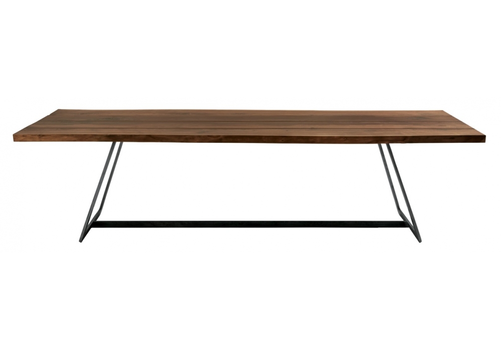 Calle Cult Natural Sides diseñada por Aldo Spinelli para Riva 1920 es una mesa realizada con una tapa de madera maciza con listones yuxtapuestos con bordes naturales, combinado con una estructura de hierro compuesta por dos patas de patín y barra central.