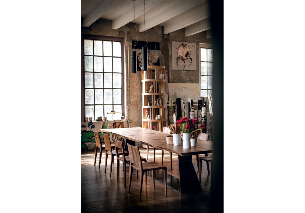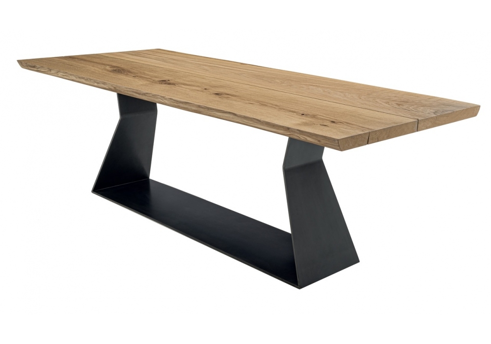 Bedrock Plank C diseñada por Terry Dwan para Riva 1920 es una mesa con tablero en madera maciza, compuesta por dos tableros simples alineados con junta central y cantos naturales. Base en chapa de hierro caracterizada por líneas geométricas.